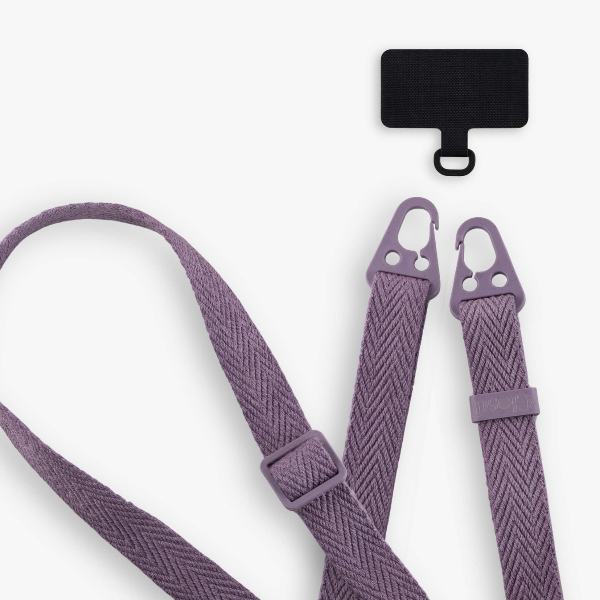 The cell phone strap is made of 100% cotton and the plastic parts on the strap are made of a recycled and extremely durable material.